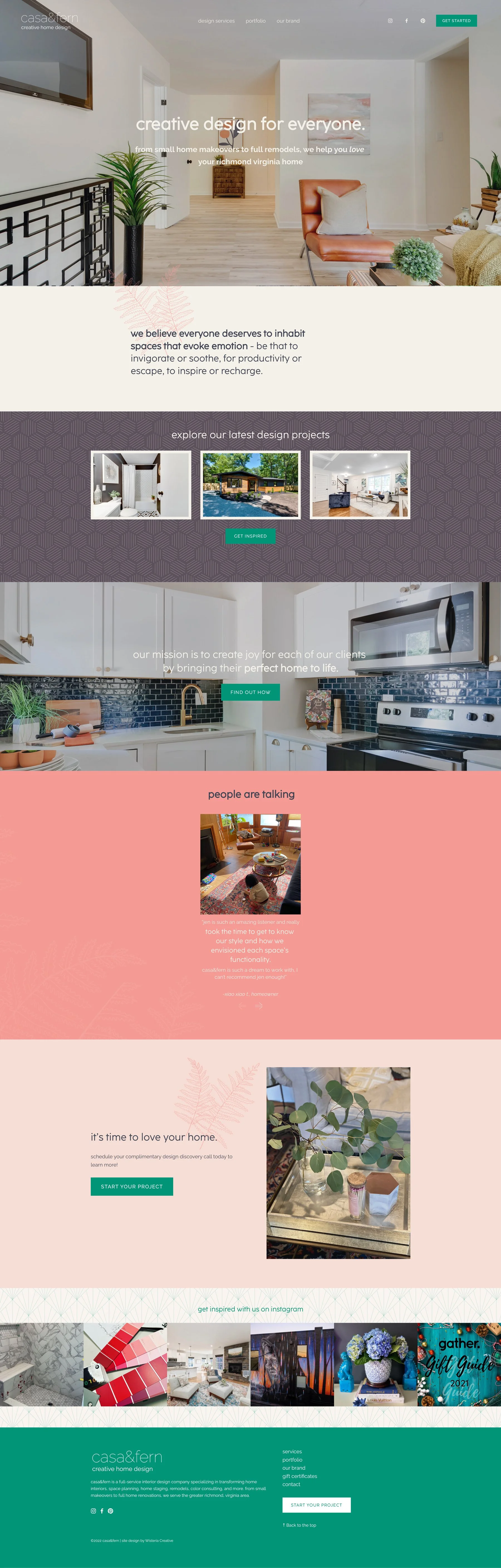 A Squarespace portfolio website was created for Richmond, Virginia Area interior designer casa&fern. Jen needed a website to showcase her design work, a way to sell her design packages, and connect with potential clients. Dubsado CRM integration was also added along with a gift certificate product.