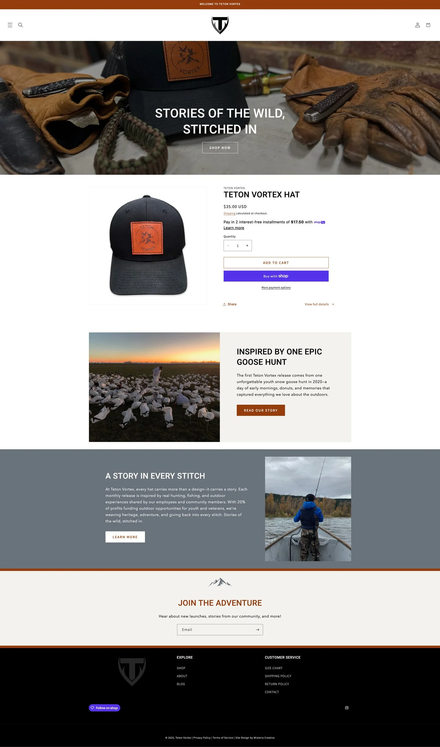 A new Shopify website was created for a newly launched brand Teton Vortex, creator of limited edition caps celebrating real outdoor adventures. The brand wanted to share the stories behind each design, as well as their mission to give back to youth and veterans through a portion of their sales and community events. Email marketing was also established with Klaviyo to help grow the brand’s reach and communicate about new launches and stories.